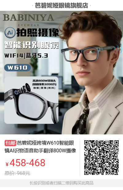 点击【阅读原文】,把芭碧妮娅W610戴回家,立即开启你的AI智能生活!传统的眼镜只能帮助我们看清楚世界,而芭碧妮娅W610智能眼镜却能让我们"看懂"世界。这款产品搭载了800万像素高清摄像头,配合先进的AI图像识别技术,能够实现毫秒级的物品识别。
